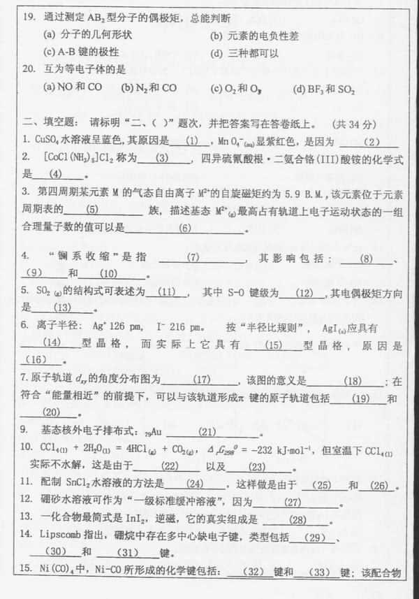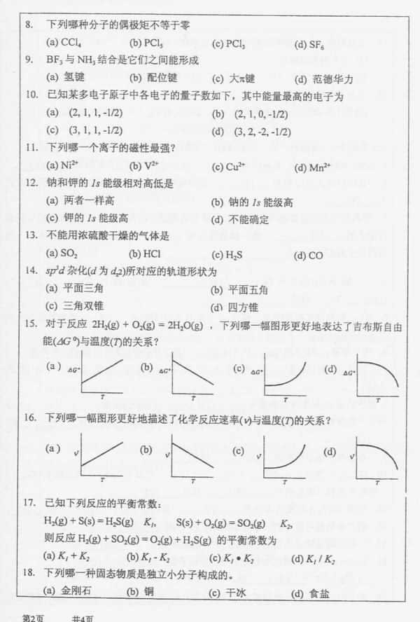 专业课考研经验 本站小编 FreeKaoyan 2018-01-22考试科目:无机化学专业:无机化学、分析化学、有机化学、物理化学研究方向:以上各专业所有方向(考生注意:全部答案必须写在答卷纸(簿)上,写在试题上无效,答案要注明题号,不用抄题。) 一.选择题(共10分)。(请标明题次,并把所选答案前的字母写在答卷纸上) 1. 根据“酸碱质子理论”,都属于“两性电解质 ...