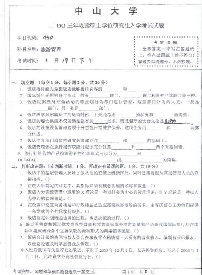 中山大学2001年攻读硕士学位研究生入学考试试题考试科目:地理学概论专业:自然地理学、人文地理学、地图学与地理信息系统一、 名词解释(每题3分)1. 流域2. 河漫滩3. 地震4. 自然规划5. 生物群落6. 维达尔7. 文化景观8. 地理学9. 聚落10. 形式文化区二、 选择题(每题3分)1.地 ...