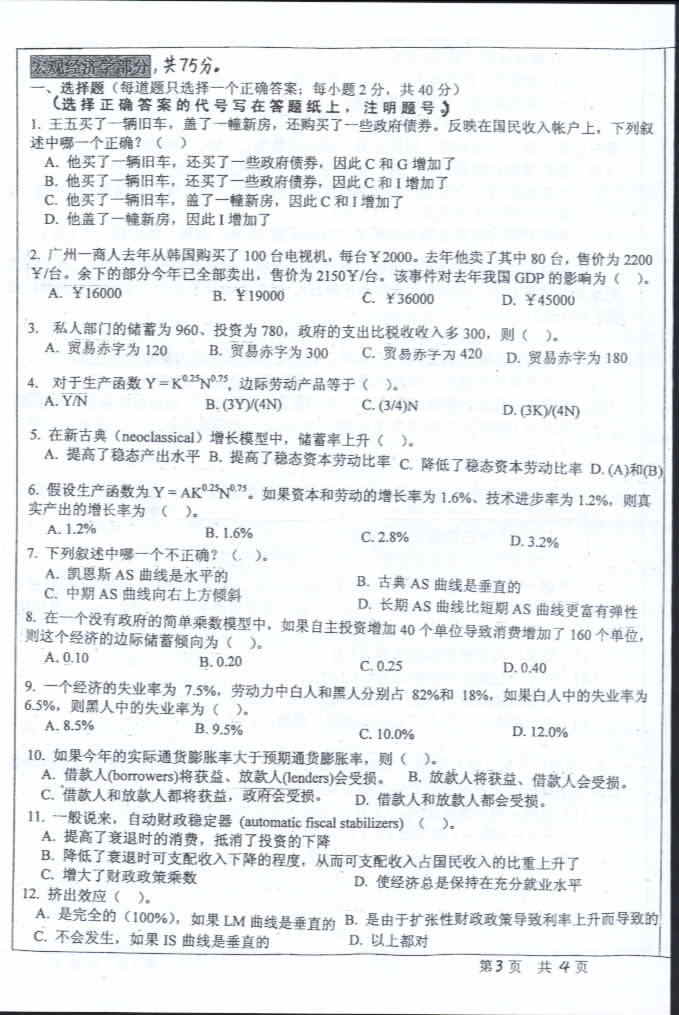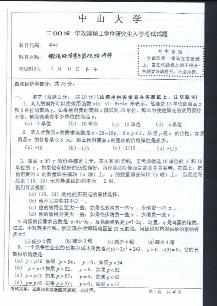 中山大学2004年考研真题-微观经济学与宏观经济学