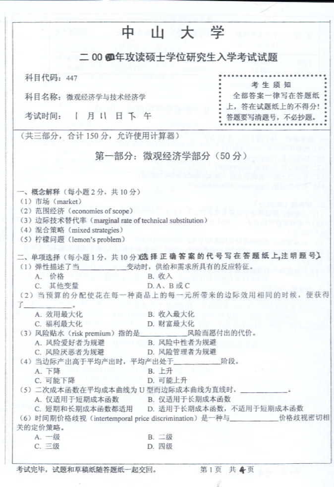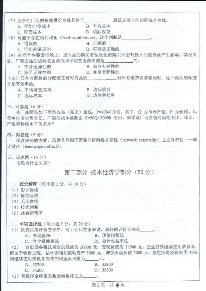 中山大学2004年考研真题-微观经济学与技术经济学