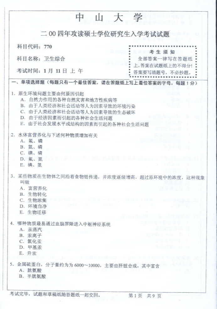中山大学2004年考研真题-卫生综合