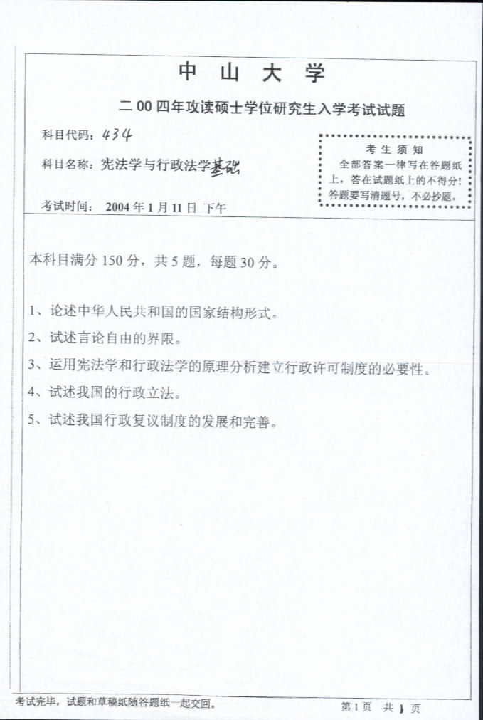 中山大学2004年考研真题-宪法学与行政法学基础