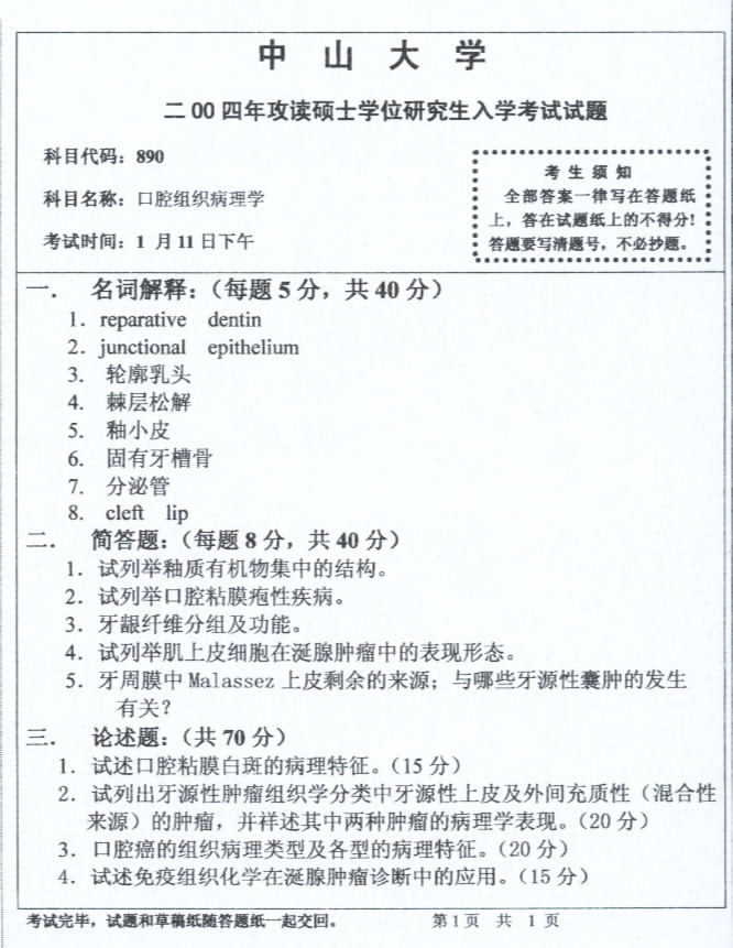 相关话题/口腔 考研真题 中山大学 组织 病理学