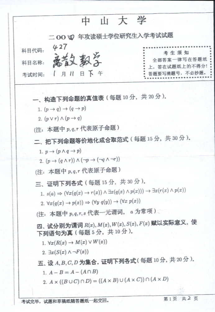 相关话题/考研真题 中山大学 离散数学