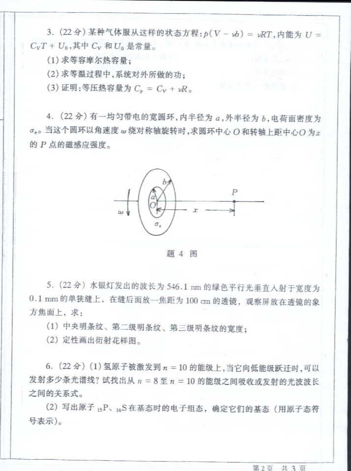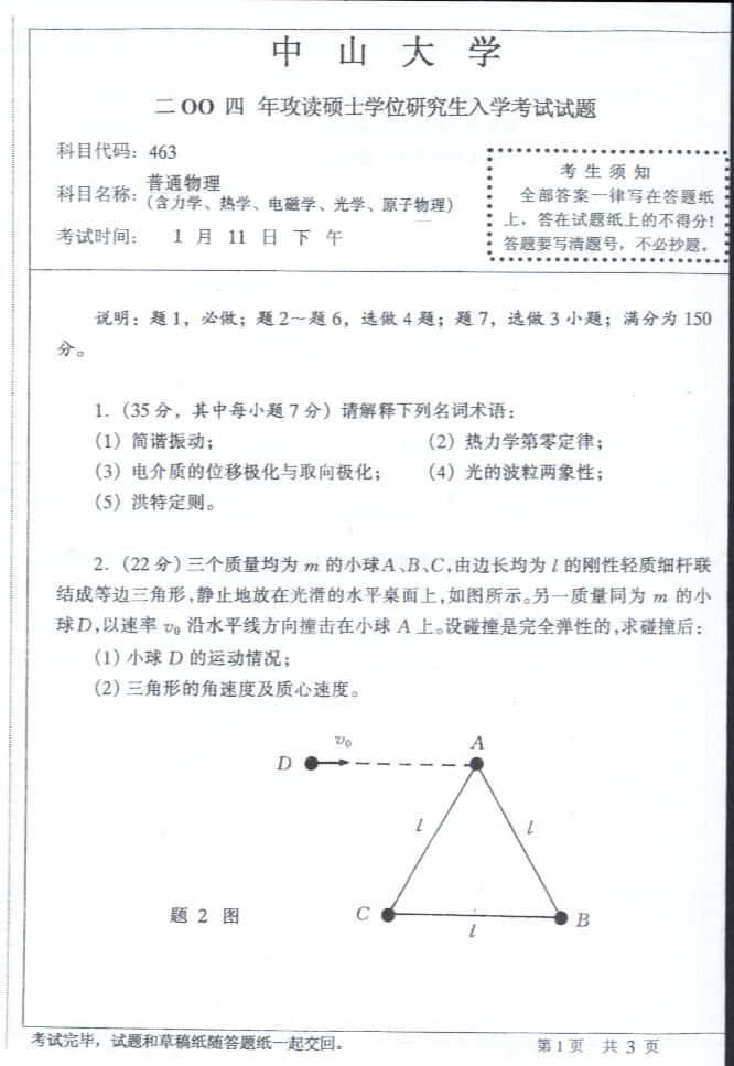 中山大学2004年考研真题-普通物理(含力学,热学,电磁学,光学,原子物理)