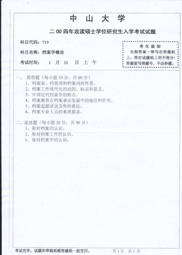 专业课考研经验 本站小编 FreeKaoyan 2018-01-22中山大学2004年考研真题-档案管理学