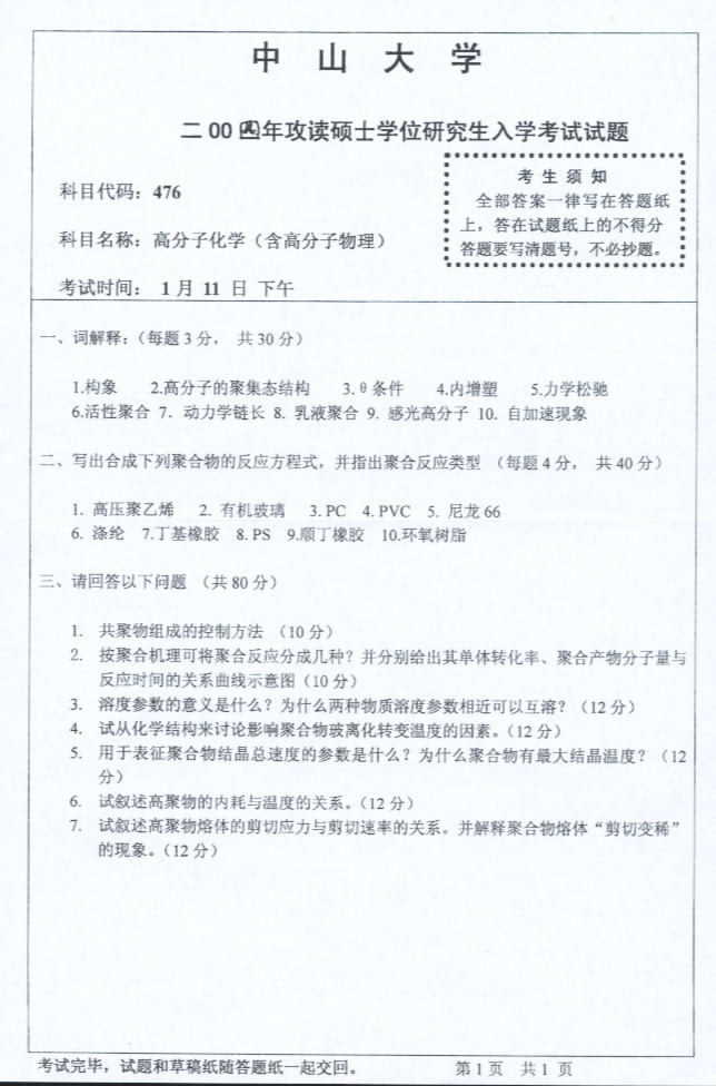 中山大学2004年考研真题-高分子化学含高分子物理