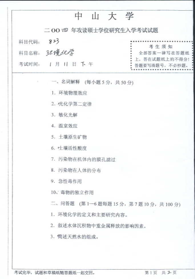 中山大学2004年考研真题-环境化学