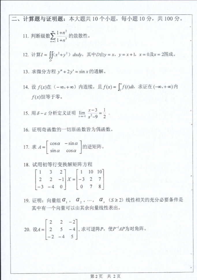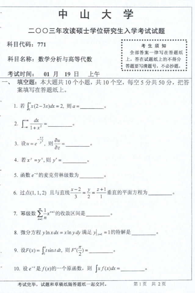中山大学2003年考研真题-数学二