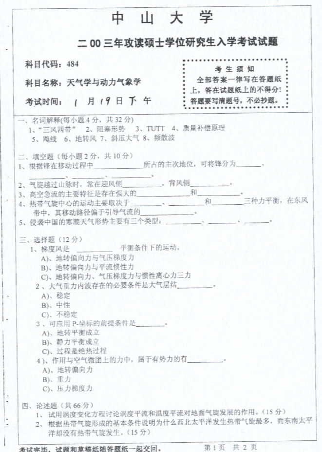 相关话题/考研真题 动力 中山大学 气象学 天气