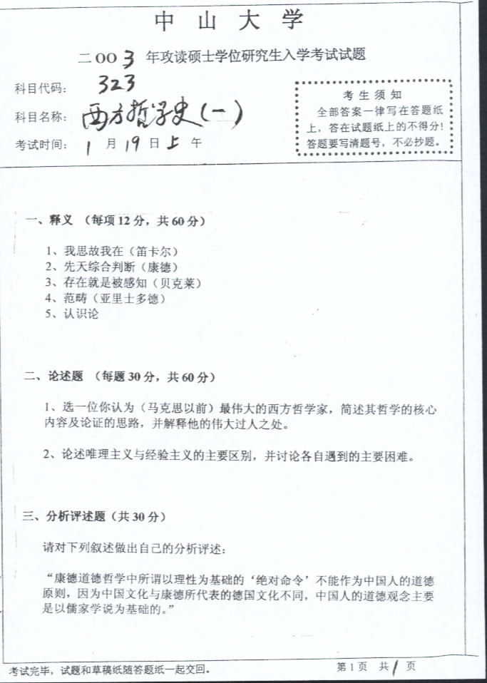 专业课考研经验 本站小编 FreeKaoyan 2018-01-22中山大学2003年考研真题-西方哲学史二