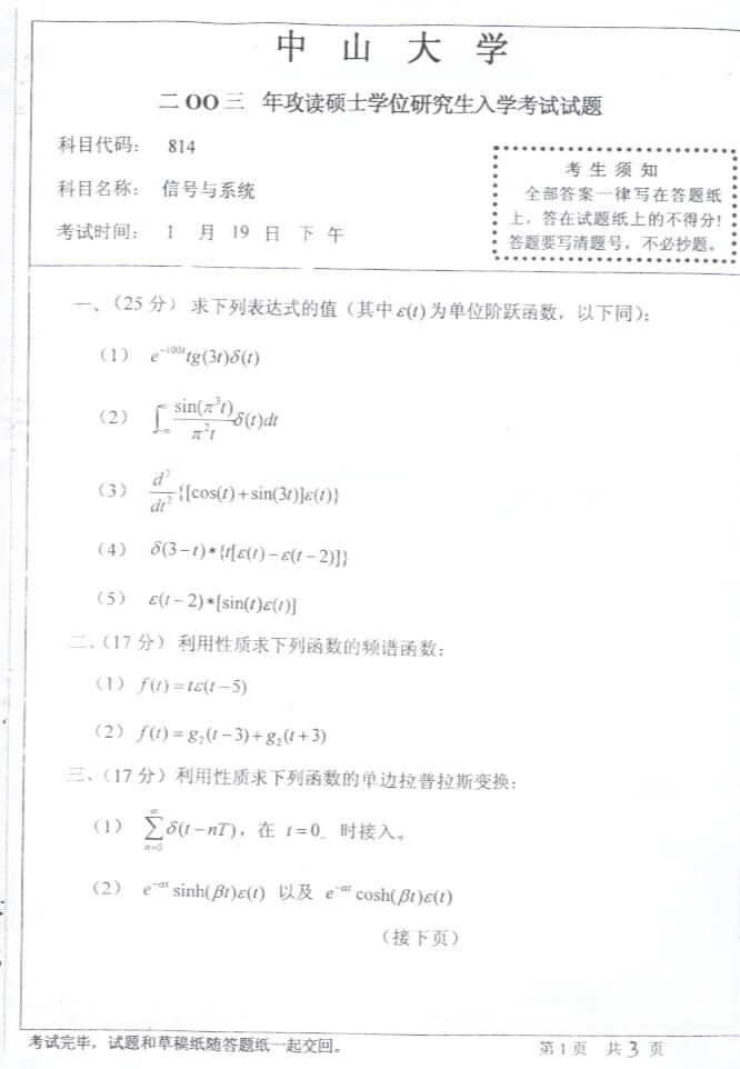 中山大学2003年考研真题-信号与系统
