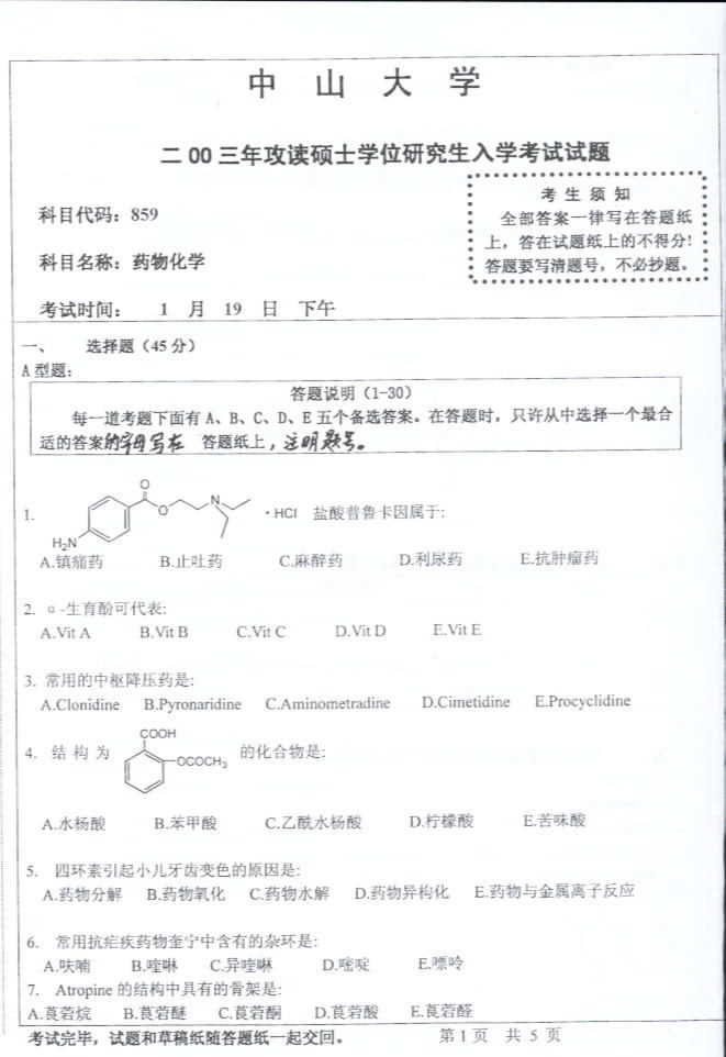 专业课考研经验 本站小编 FreeKaoyan 2018-01-22中山大学2003年考研真题-药化综合