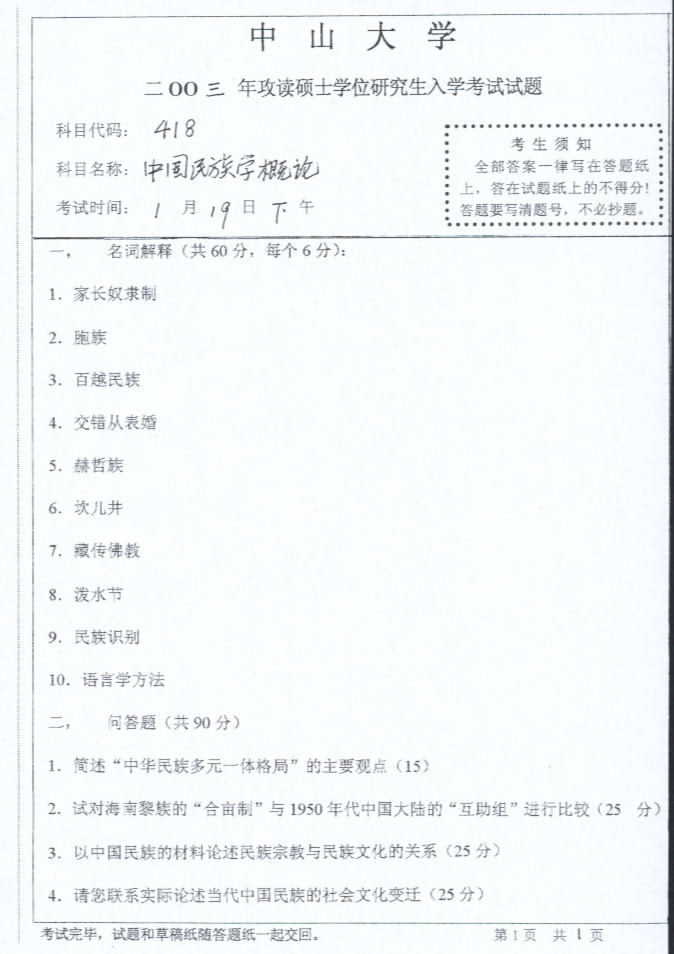 中山大学2003年考研真题-中国民族学概论