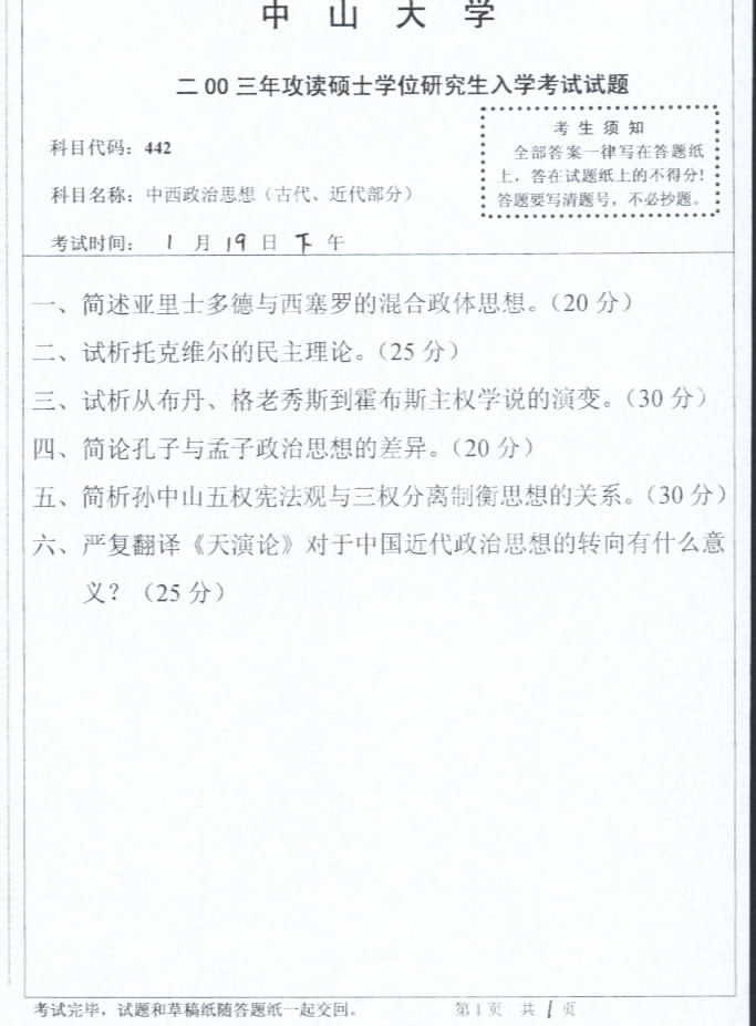 中山大学2003年考研真题-中西政治思想(古代,近代部分)