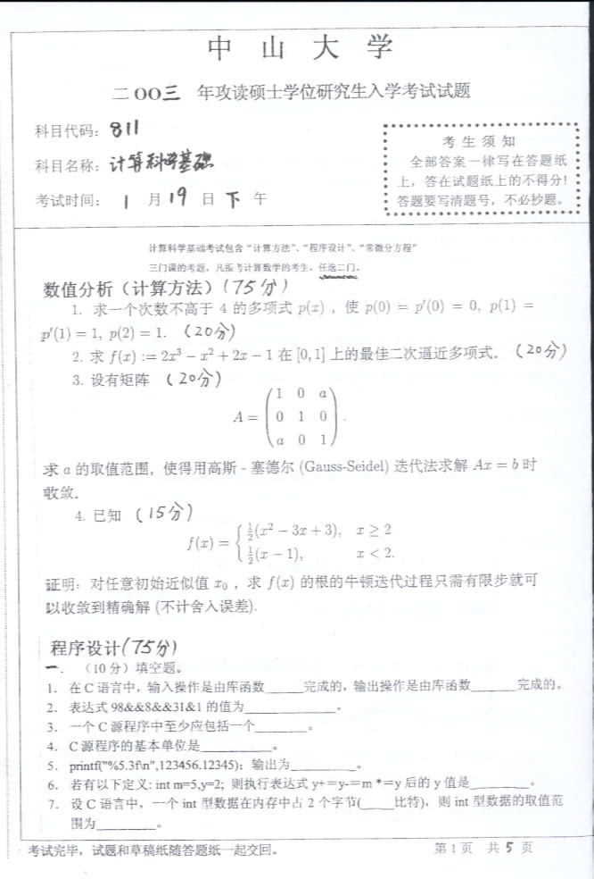 中山大学2003年考研真题-计算科学基础