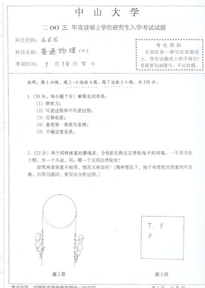 专业课考研经验 本站小编 FreeKaoyan 2018-01-22中山大学2003年考研真题-普通物理
