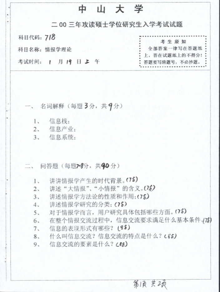 中山大学2003年考研真题-情报学理论
