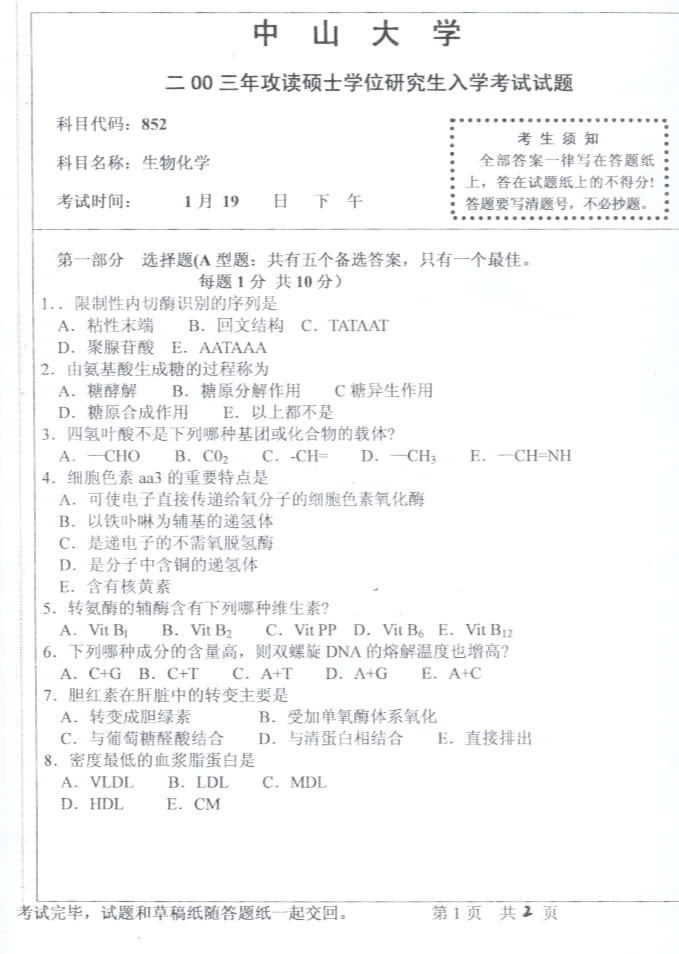 中山大学2003年考研真题-生物化学