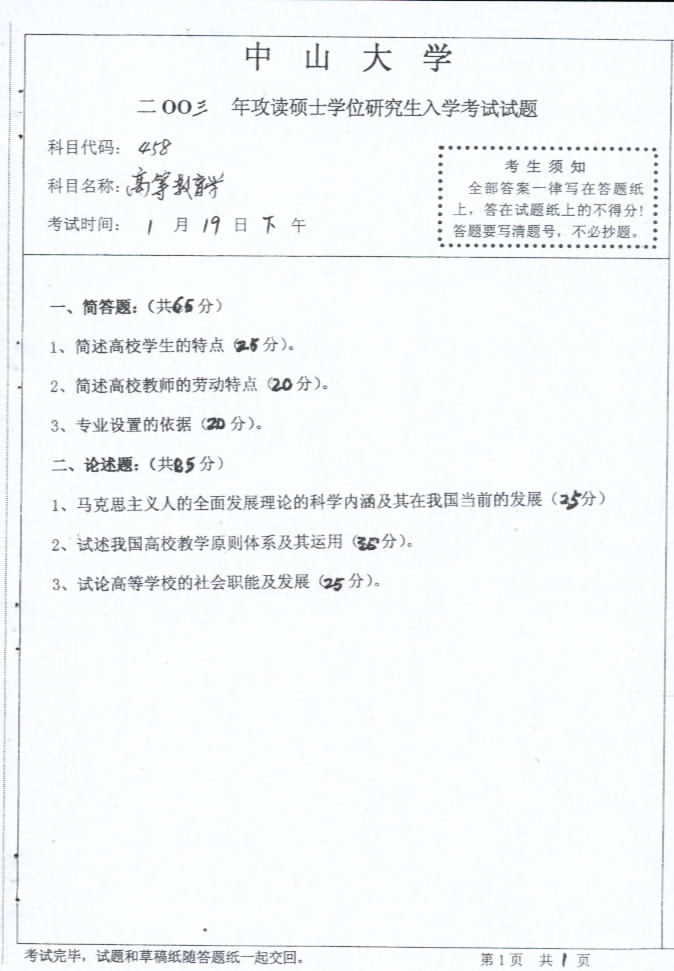 专业课考研经验 本站小编 FreeKaoyan 2018-01-22中山大学2003年考研真题-动物学