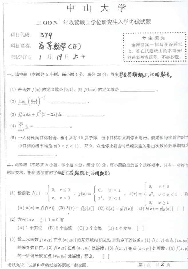 中山大学2003年考研真题-高等数学B