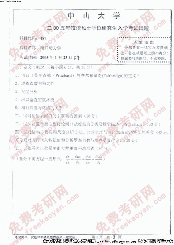 专业课考研经验 本站小编 FreeKaoyan 2018-01-22中山大学2003年考研真题-河口动力学