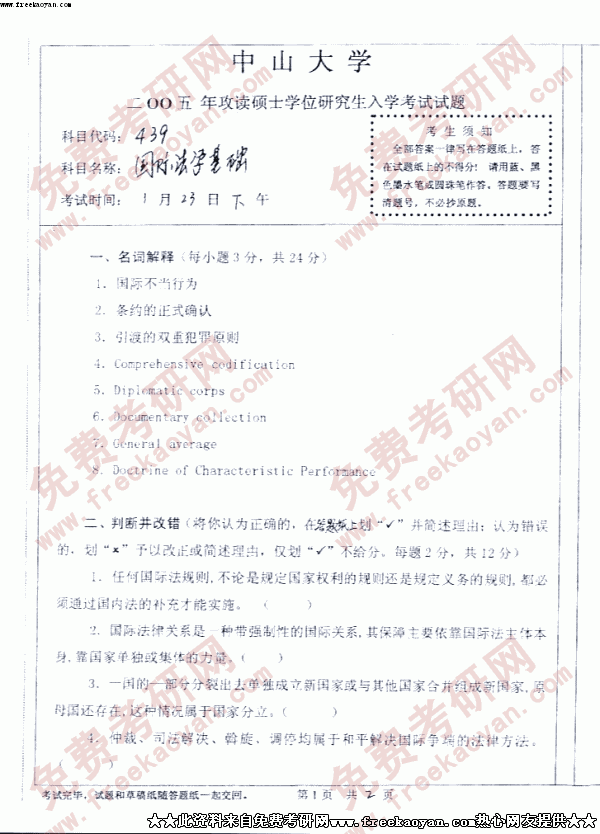 中山大学2005年考研真题-国际法学基础
