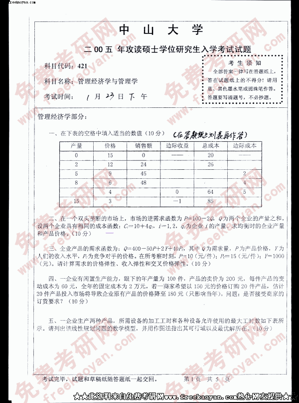中山大学2005年考研真题-管理经济学与管理学