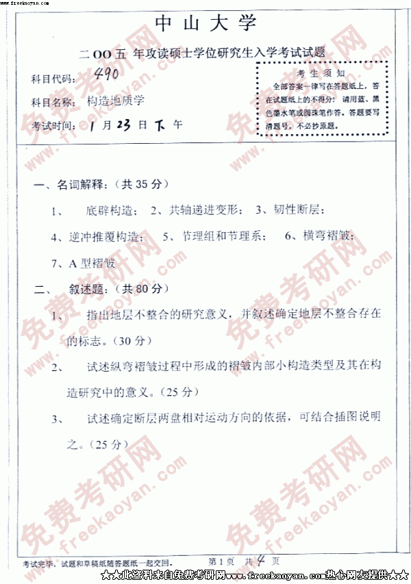中山大学2005年考研真题-构造地质学