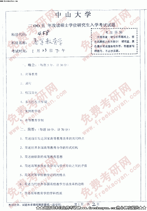 中山大学2005年考研真题-高分子化学(含高分子物理)