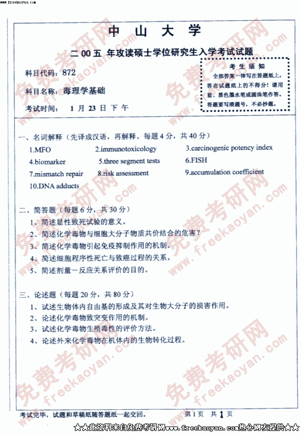 中山大学2005年考研真题-毒理学基础
