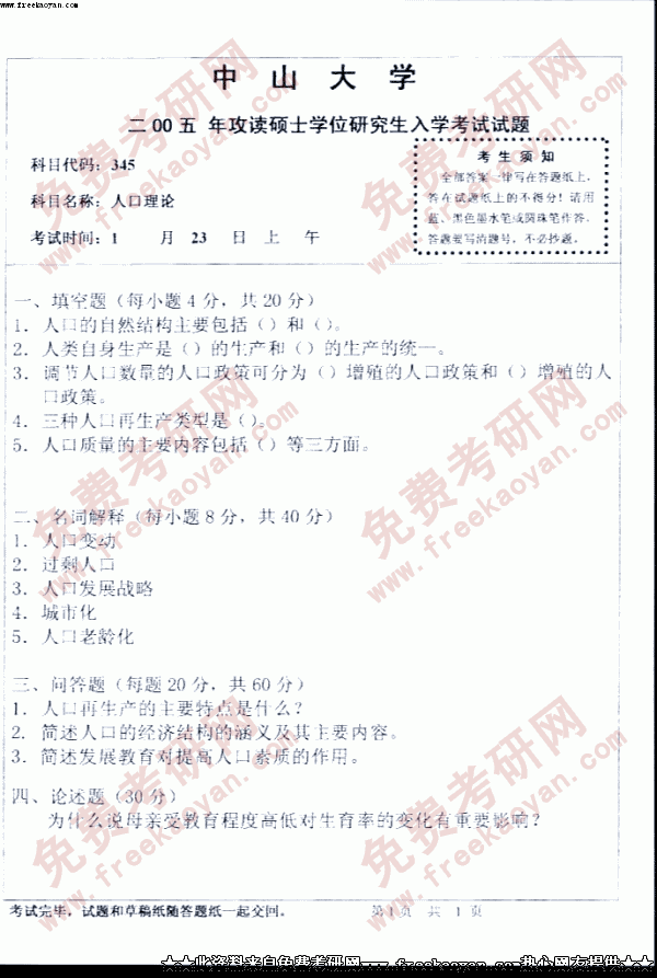 专业课考研经验 本站小编 FreeKaoyan 2018-01-22中山大学2005年考研真题-人口统计