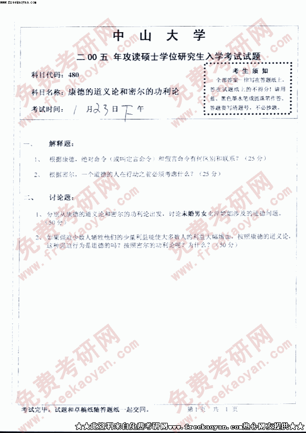 中山大学2005年考研真题-康德的道义论与密尔的功利论