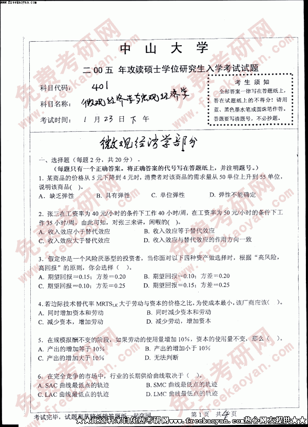 中山大学2005年考研真题-微观经济学与宏观经济学单考