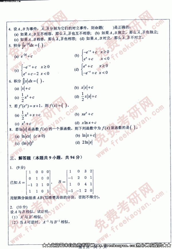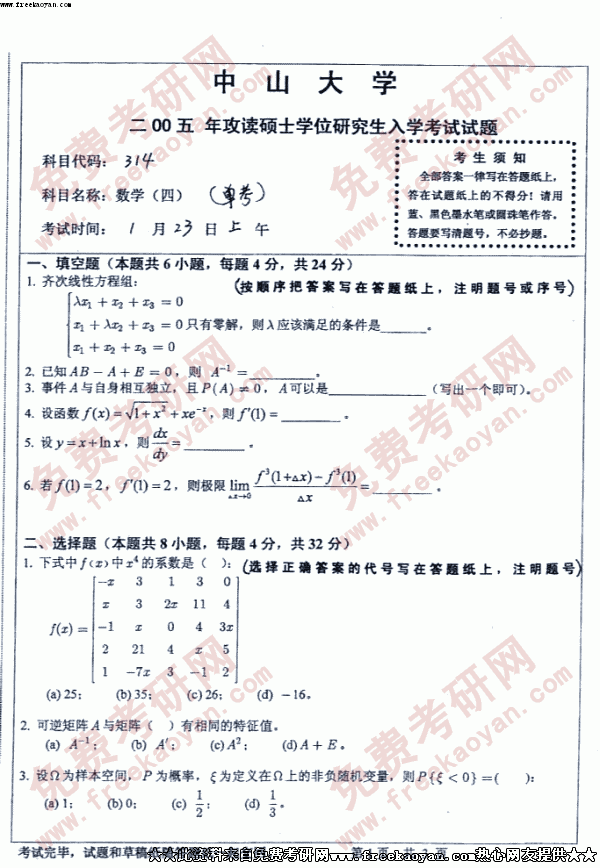 中山大学2005年考研真题-数学四单考