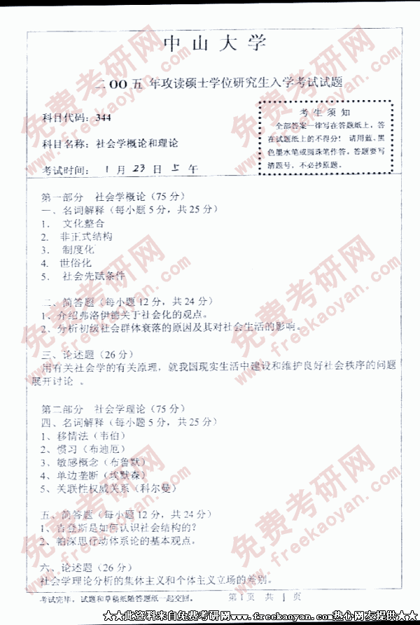 中山大学2005年考研真题-社会学概论与理论