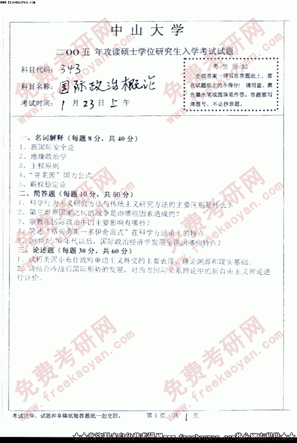 专业课考研经验 本站小编 FreeKaoyan 2018-01-22中山大学2005年考研真题-政治科学