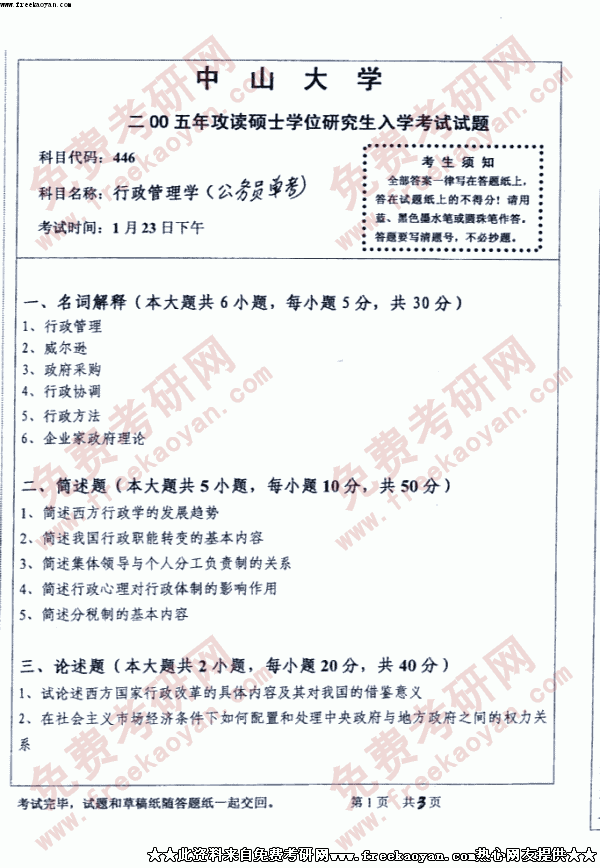 中山大学2005年考研真题-行政管理学(公务员单考)