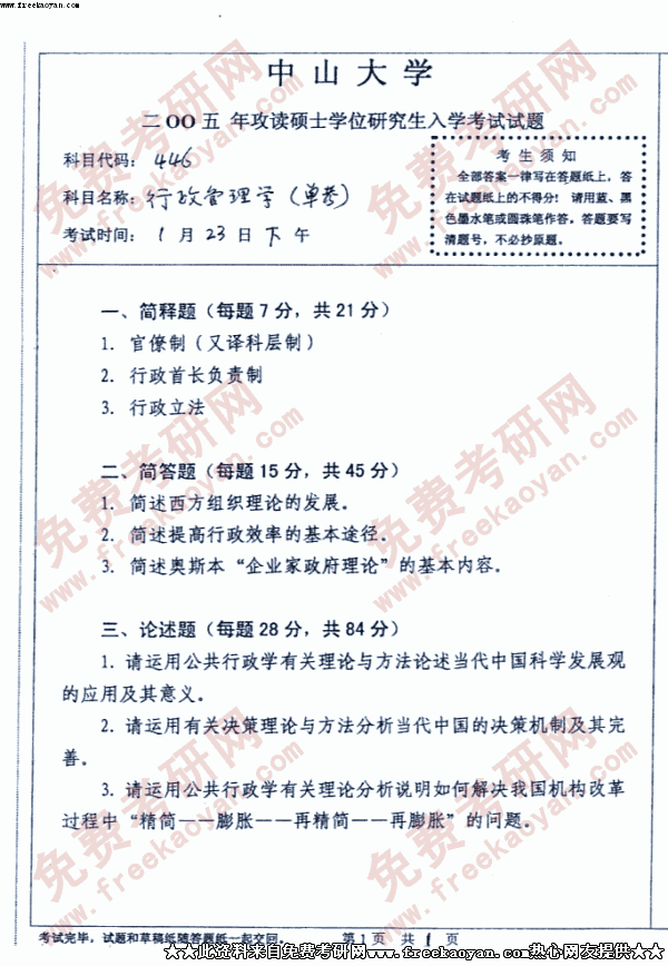 专业课考研经验 本站小编 FreeKaoyan 2018-01-22中山大学2005年考研真题-行政管理学(公务员单考)