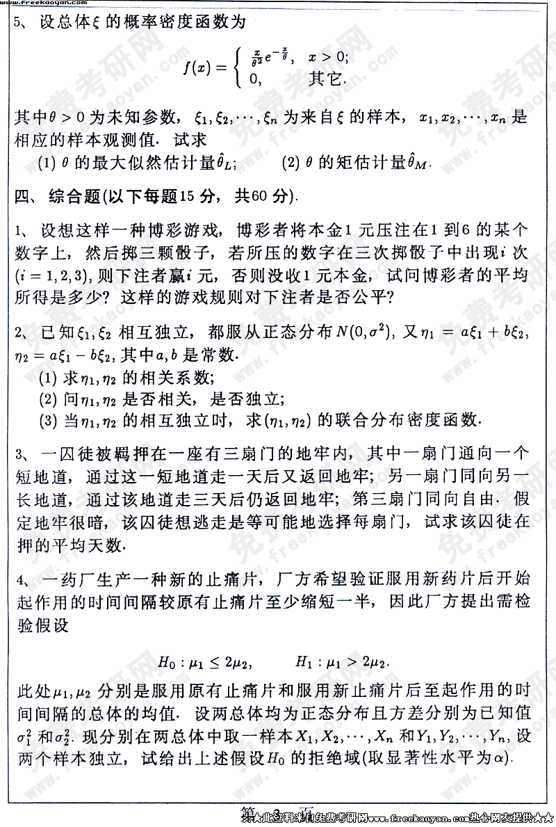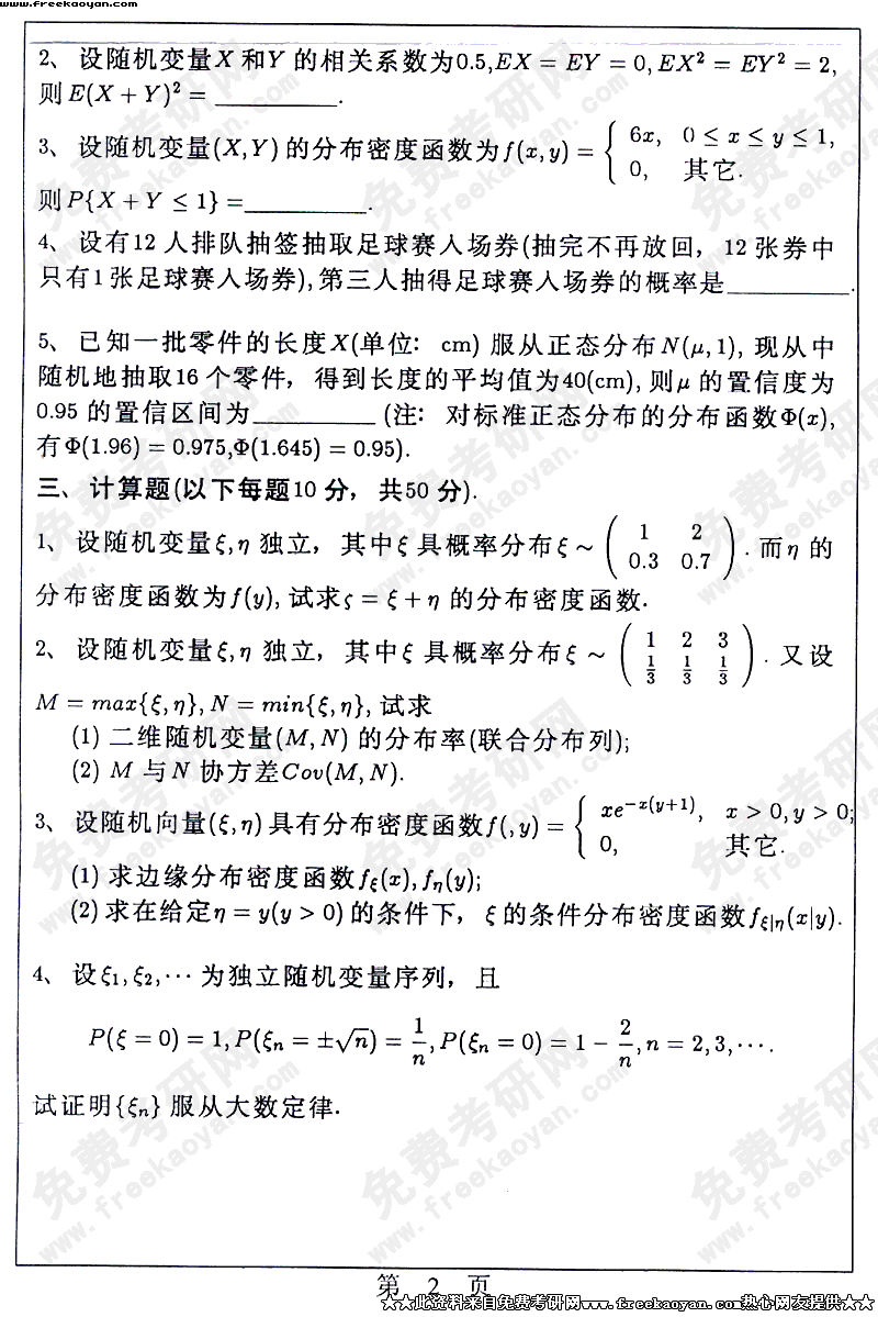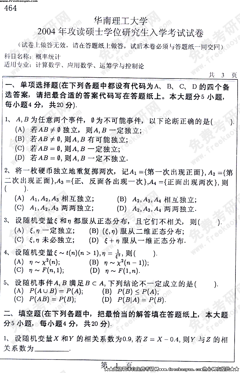 华南理工大学2004年考研真题-概率统计