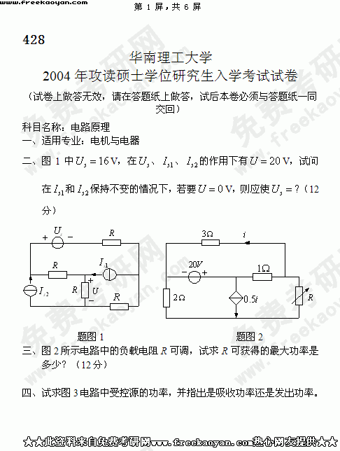 华南理工大学2004年考研真题-电子技术基础(含数字与模拟电路)