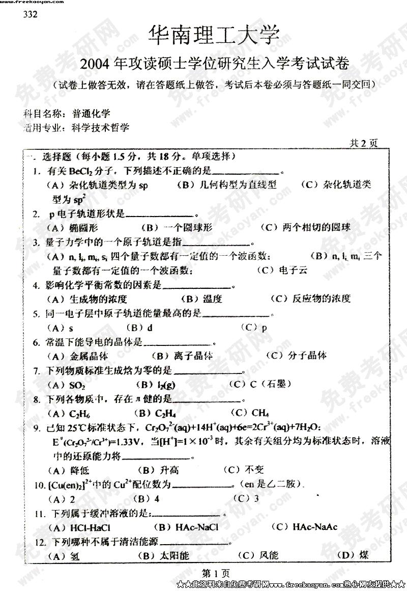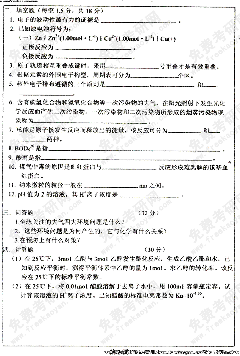 华南理工大学2001年考研真题-物理化学(含物理化学实验)有答案