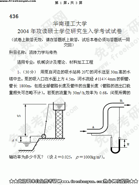 华南理工大学2004年考研真题-普通物理(含力学、热学、电学、光学)