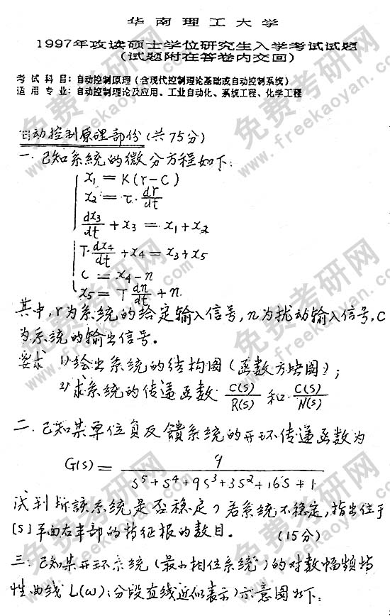 华南理工大学1997年考研真题-自动控制原理(含现代控制理论基础和自动控制系统)