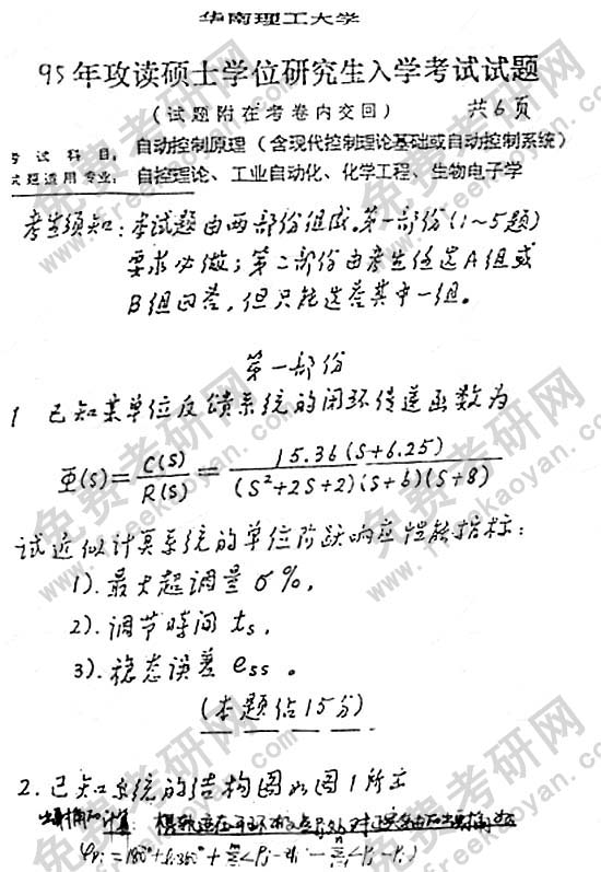 华南理工大学1995年考研真题-自动控制原理(含现代控制理论基础和自动控制系统)