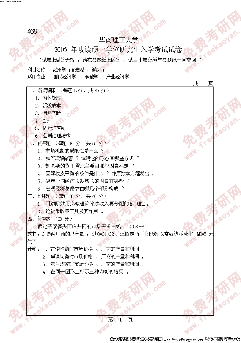 华南理工大学2005年考研真题-经济学(含宏观、微观)