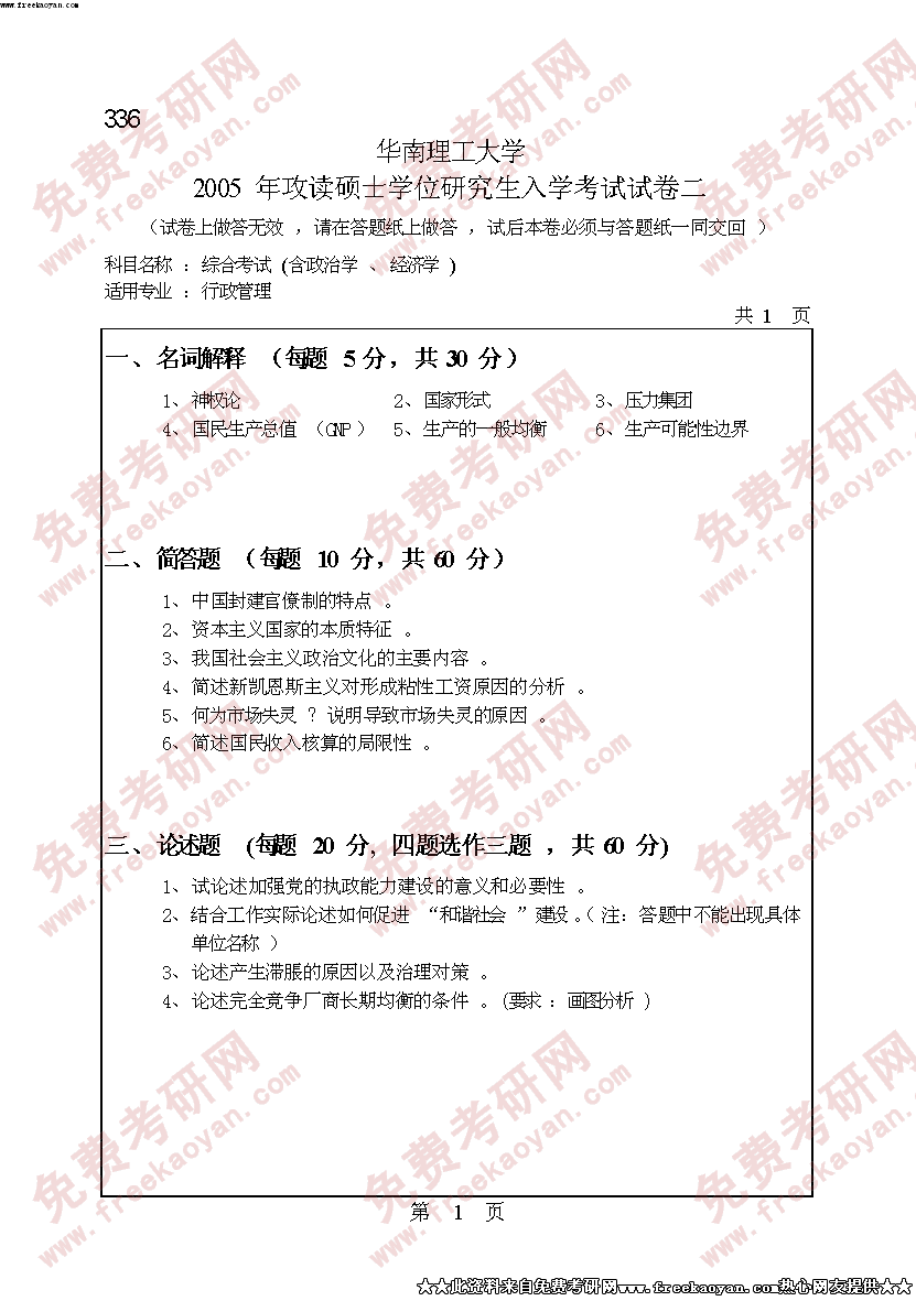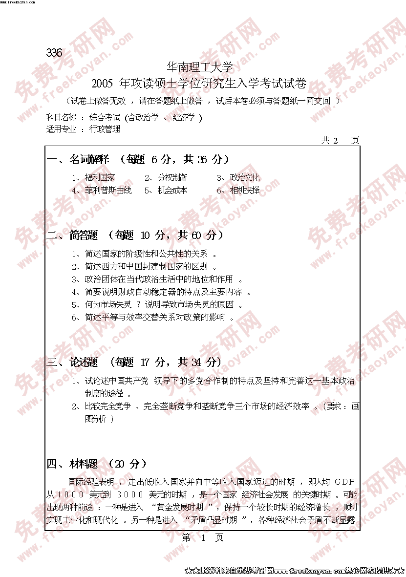 华南理工大学2005年考研真题-综合考试含政治学、经济学