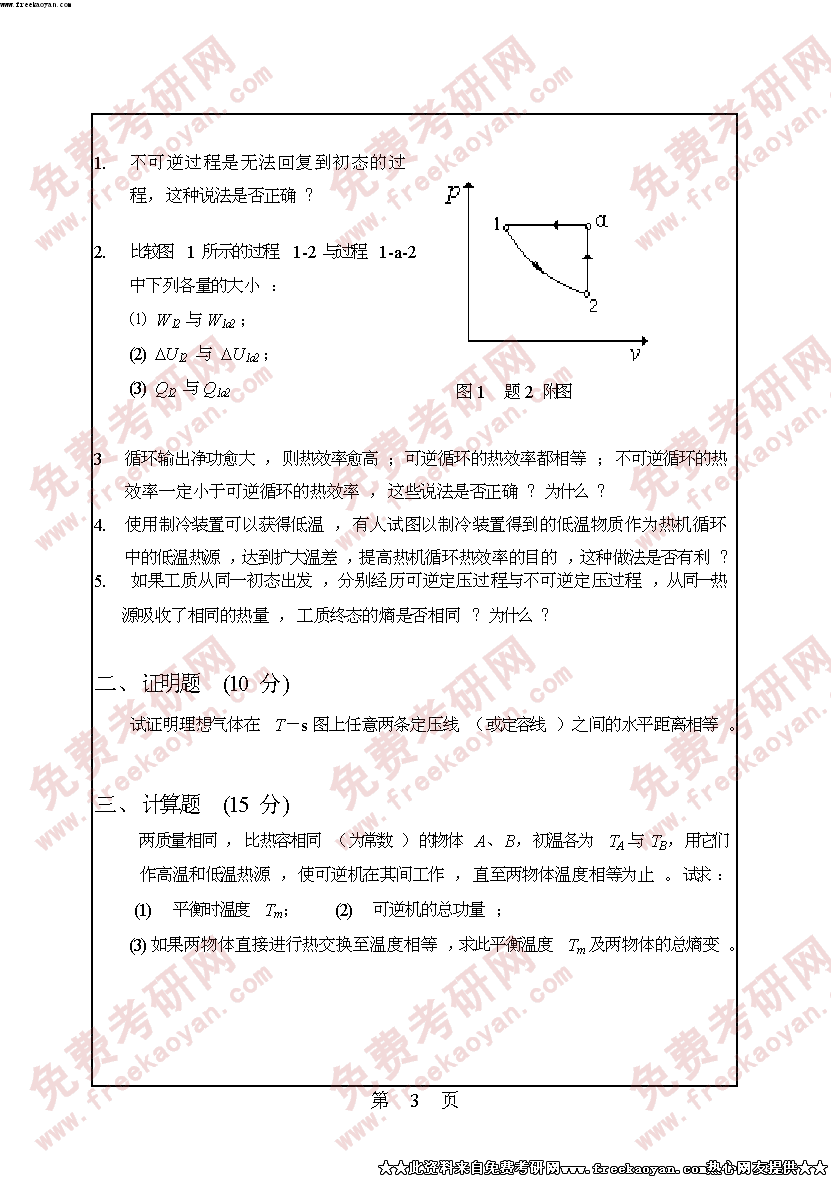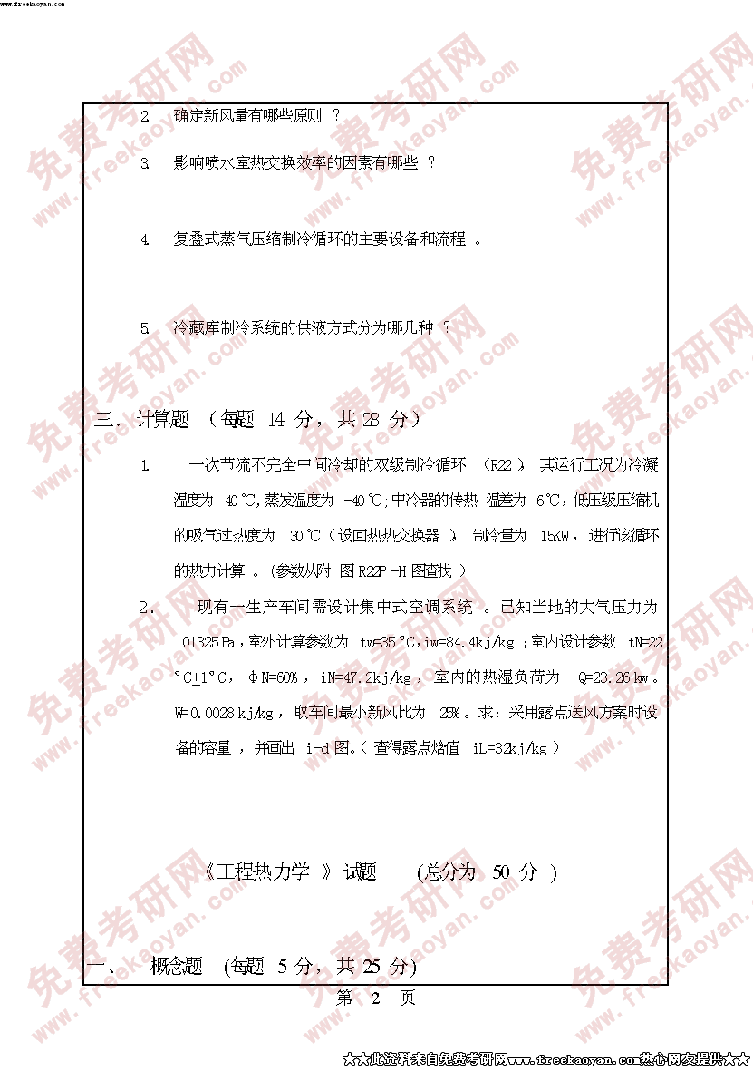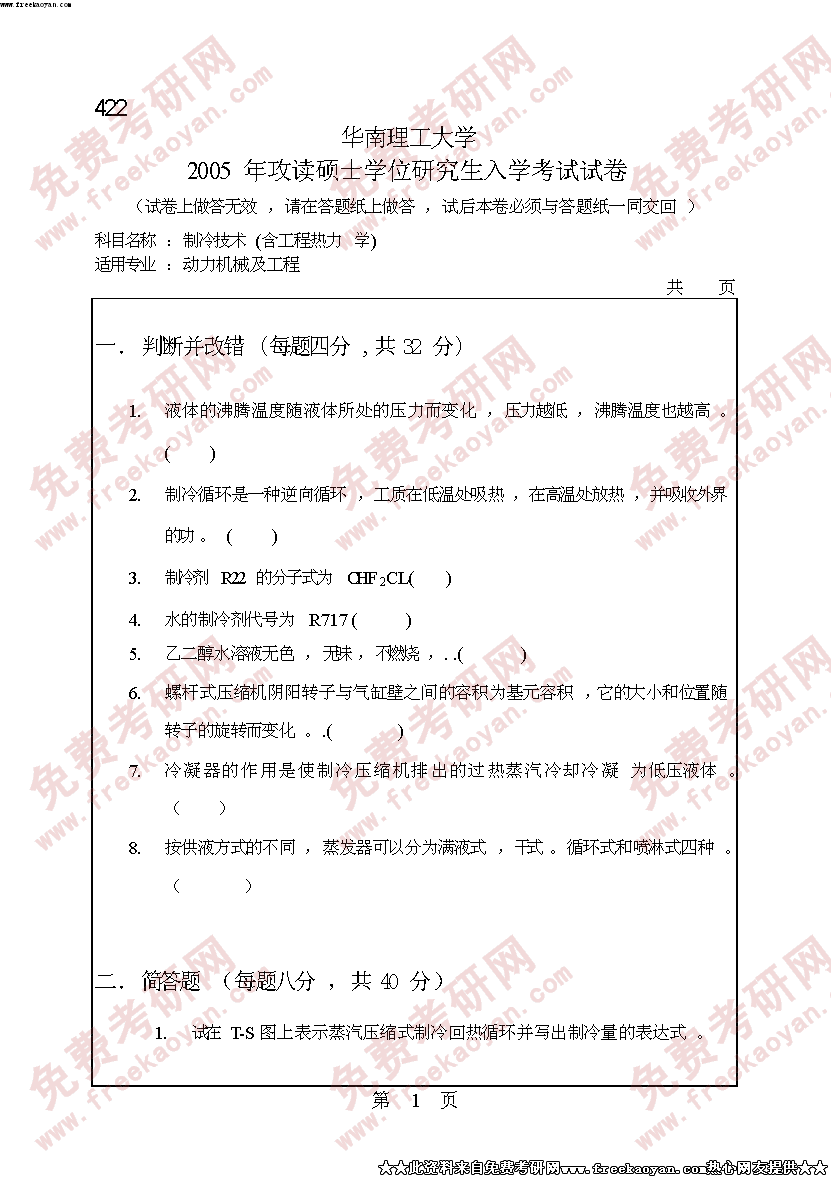 华南理工大学2005年考研真题-制冷技术含工程热力学