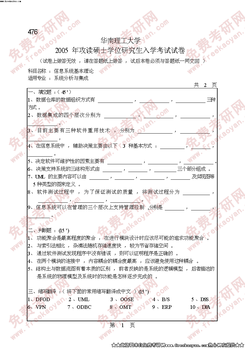 华南理工大学2005年考研真题-应用数学基础含计算方法、常微分方程