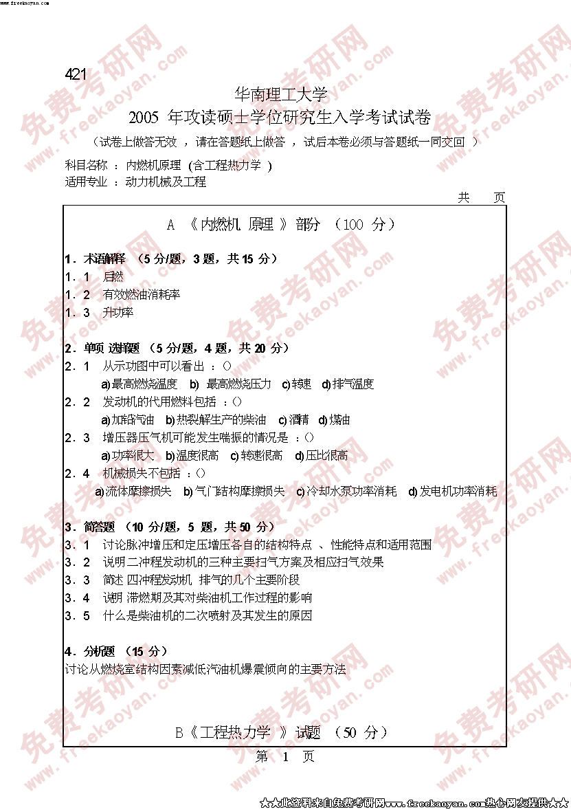 华南理工大学2005年考研真题-内燃机原理含工程热力学